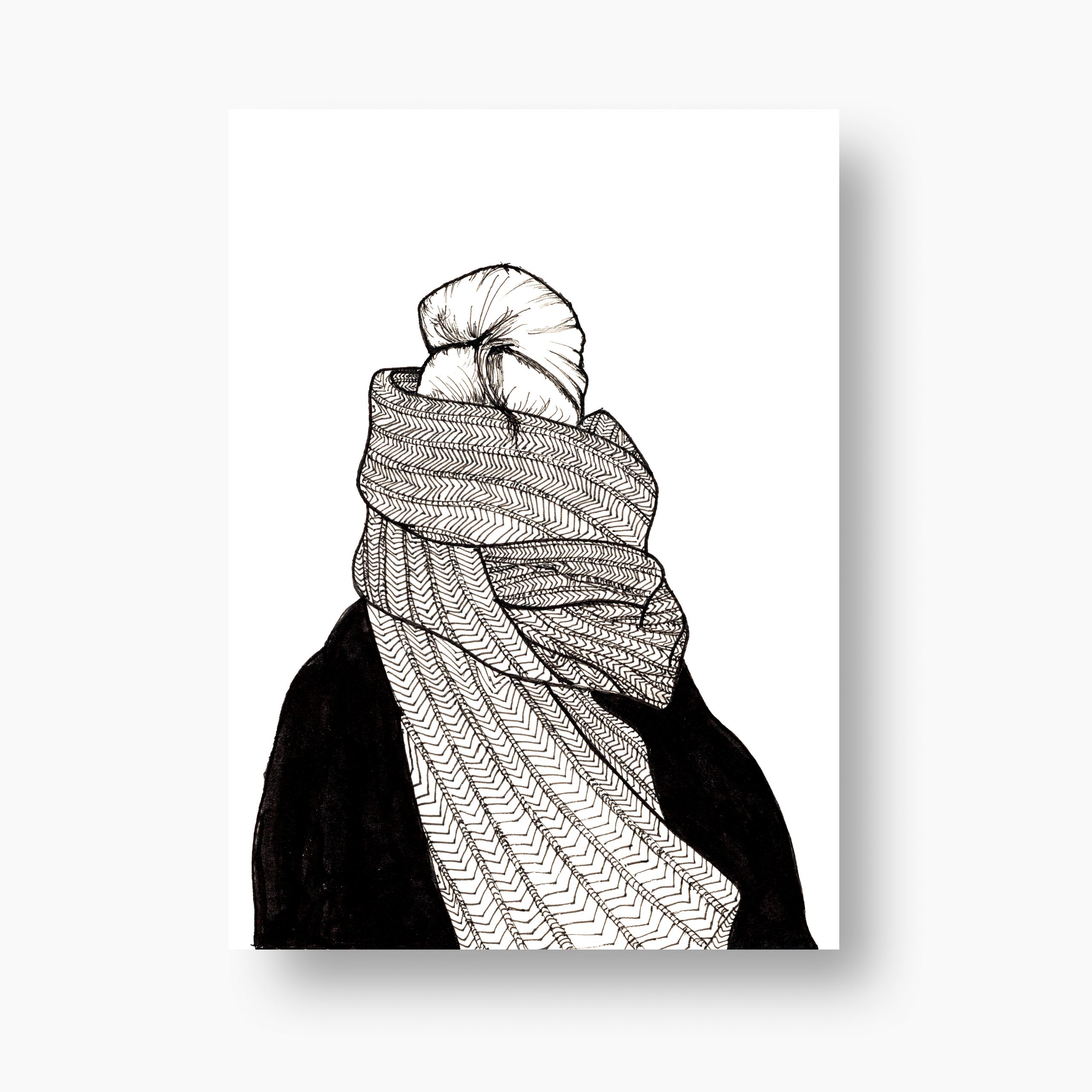 Realizada en tinta negra, cada trazo aporta profundidad y textura, destacando la delicadeza de la tela que envuelve a la figura. .
