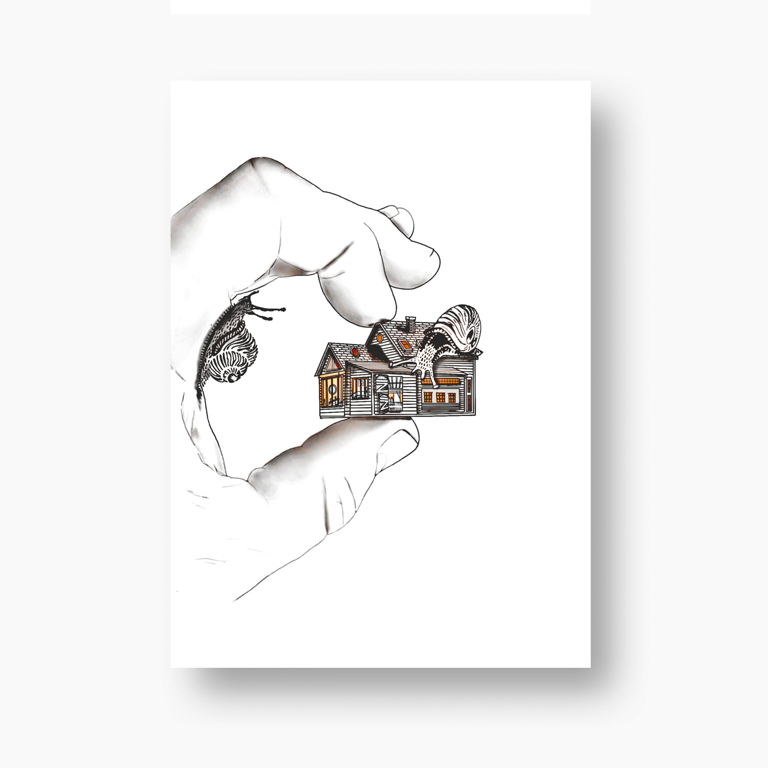 Los caracoles, ubicados en el tejado de la casa y sobre la mano, actúan como guardianes de este microcosmos. Su presencia, delicada y serena, aporta una dimensión única y fidedigna, sugiriendo un ritmo pausado y una belleza en la atención a los detalles. Juntos, forman un marco que resalta la fragilidad y la fortaleza de la vida.