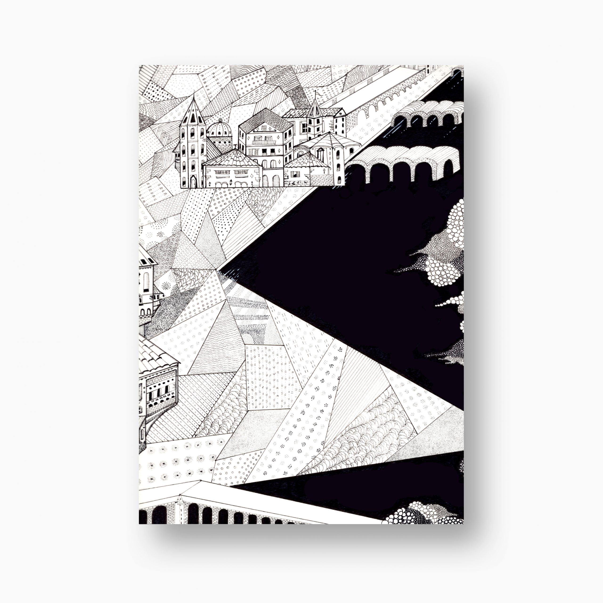 Natural Geometry es una disección visual del paisaje rural desde la óptica del contraste y la conexión. Realizada íntegramente en fineliner, esta lámina traza con meticulosidad quirúrgica la coexistencia entre dos formas de orden: el orgánico y el construido.