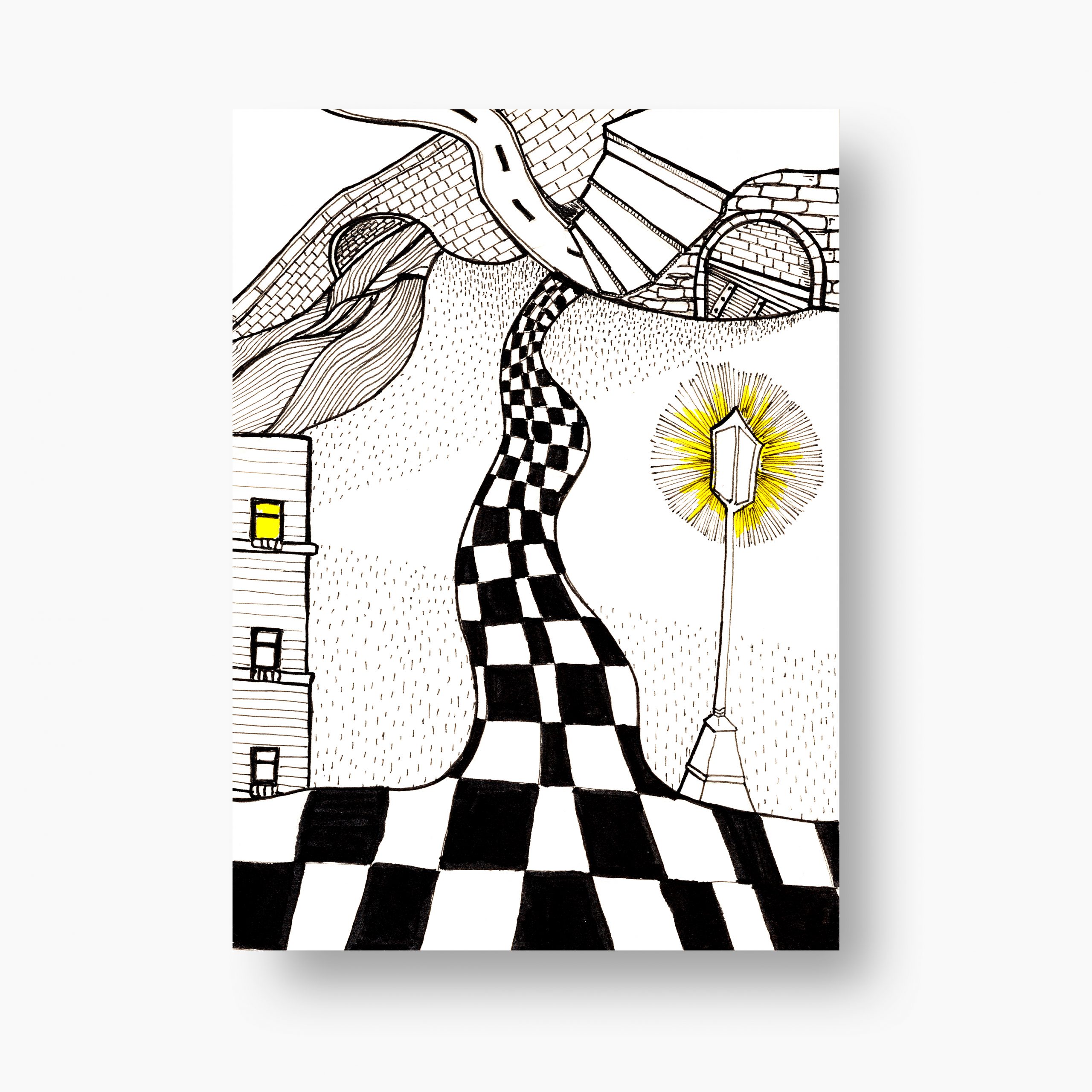 Un juego de luces y sombras en el tablero de la ciudad «Partida Urbana» es una representación de lo urbano. En el corazón de esta escena, un suelo ajedrezado se extiende como un tablero de juego. Esta enmarcado bajo un edificio, y puentes entrelazados que simbolizan las conexiones humanas que se forjan en el camino. La farola, iluminada con un brillo cálido, proyecta  luz sobre el tablero y revelando los secretos que esconde la noche. «Partida Urbana» invita a reflexionar sobre las interacciones que marcan nuestra vida , recordándonos que, al igual que en el ajedrez, cada movimiento cuenta y cada esquina puede deparar una nueva sorpresa. Esta pieza es perfecta para quienes aprecian la belleza de lo cotidiano, el ritmo de la vida urbana y el arte que refleja la complejidad de nuestras interacciones. Tamaños disponibles: A3 / A4 Gramaje: 280/300gr