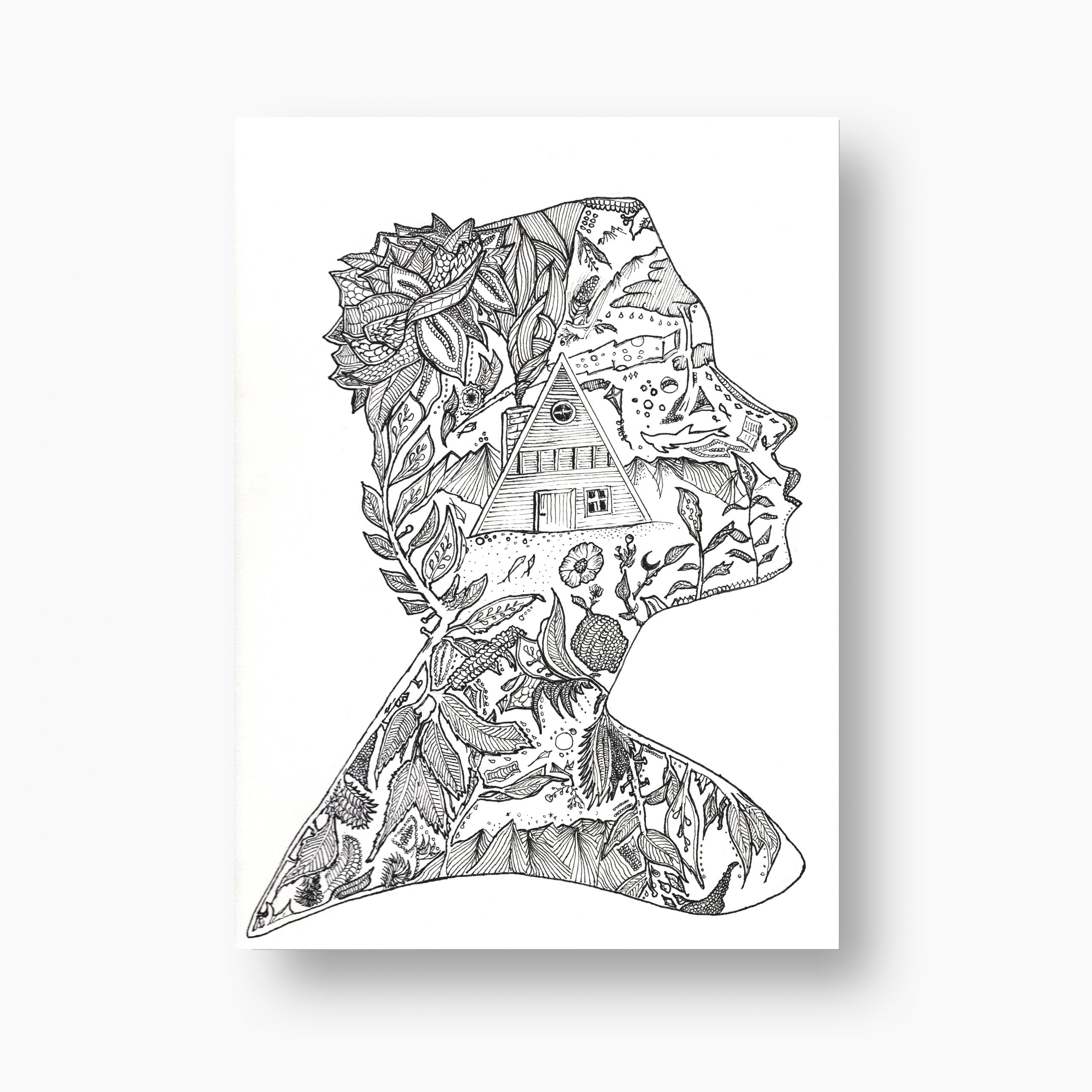 «Refugio» es una obra que encapsula la esencia de la protección, el amor y la sabiduría que se encuentran en las figuras femeninas de nuestras vidas. A través de la silueta de una mujer de perfil, la composición se convierte en un espacio donde conviven la naturaleza, los recuerdos y la imaginación. Dentro de esta forma, motivos florales y elementos naturales se entrelazan con la vida marina, sugiriendo un ecosistema vibrante que refleja la riqueza de la existencia.