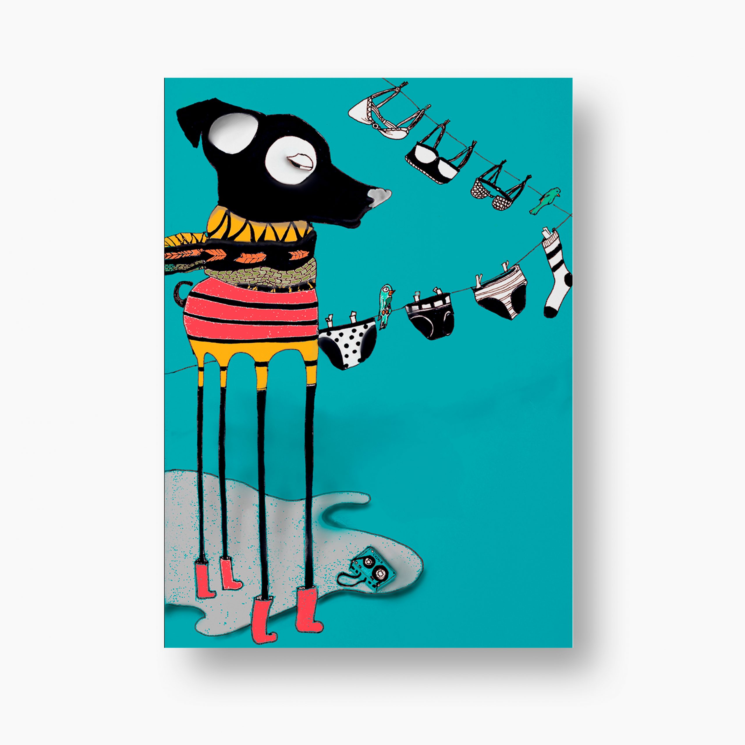 El entorno está lleno de vida y color: un charco refleja la luz del día, creando un pequeño espejo en el suelo que complementa la escena. A su alrededor, ropa limpia se seca al viento, dejando entrever que el perro podría estar pensando en hacer una travesura con esas prendas frescas. La inclusión de una antigua cinta de casete añade un toque nostálgico y juguetón, evocando recuerdos de tiempos pasados.